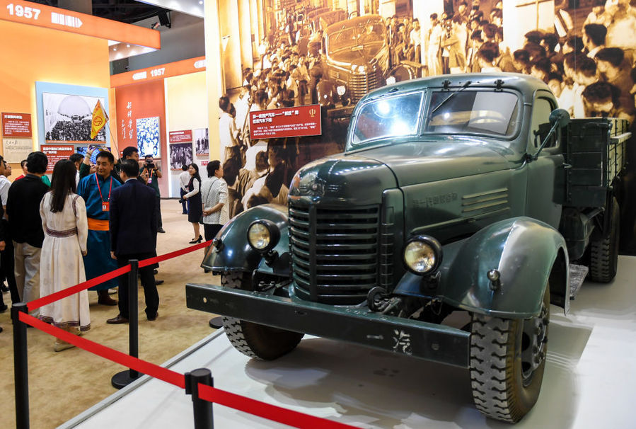 “伟大历程 辉煌成就——庆祝中华人民共和国成立70周年大型成就展”上1956年制造的“解放”牌汽车。新华社记者彭源摄