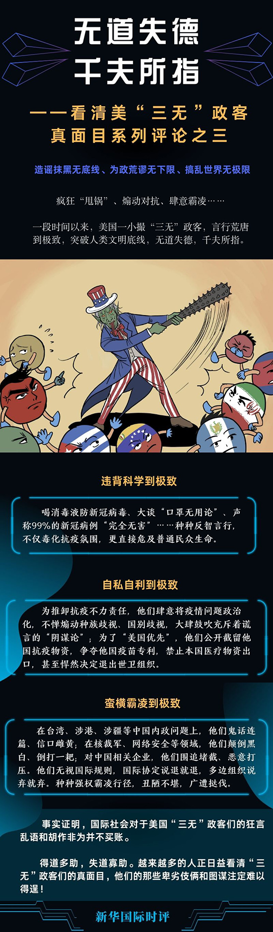 “三无”政客们蛮横霸凌到极致。在台湾、涉港、涉疆等中国内政问题上,他们鬼话连篇、信口雌黄;在核裁军、网络安全等领域,他们颠倒黑白、倒打一耙;对中国相关企业,他们围追堵截、恶意打压。他们无视国际规则,伊核协议、《中导条约》等国际协定,说退就退;联合国教科文组织、联合国人权理事会等多边组织,说弃就弃。种种强权霸凌行径,丑陋不堪,广遭挞伐。