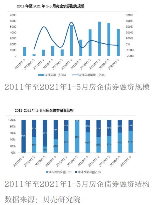 据贝壳研究院数据显示,今年1-5月房企境内外债券融资累计约4624亿元,同比下降18%,达到近三年低点。其中,5月单月境内外债券融资共发行52笔,发行规模折合人民币约647亿元,环比减少30.9%,同比增长4.9%。